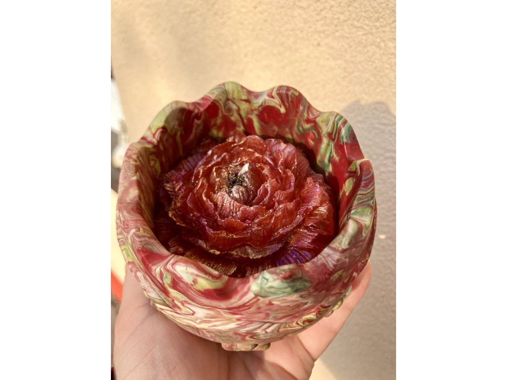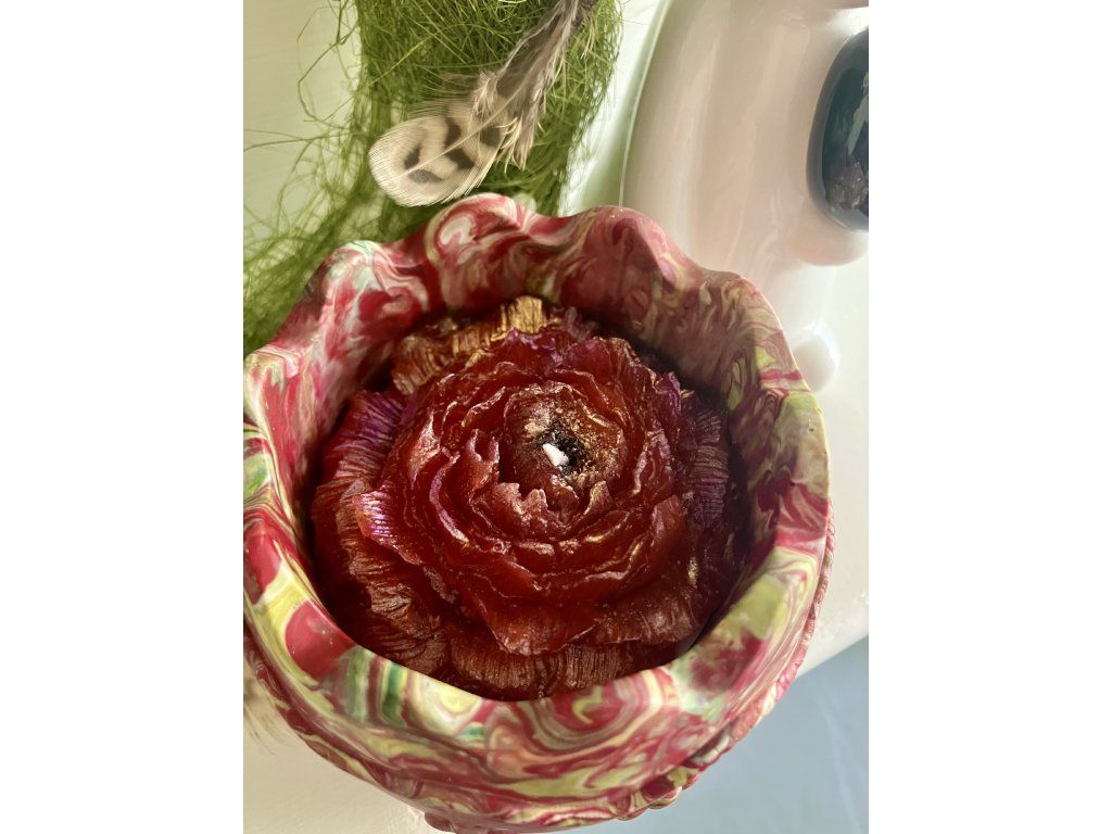 Základ svíčky ze 100 % přírodního sójového vosku s ozdobnou růží z minerálního gelového vosku.