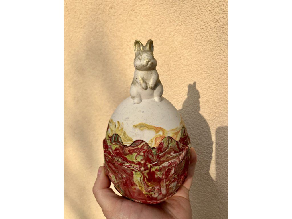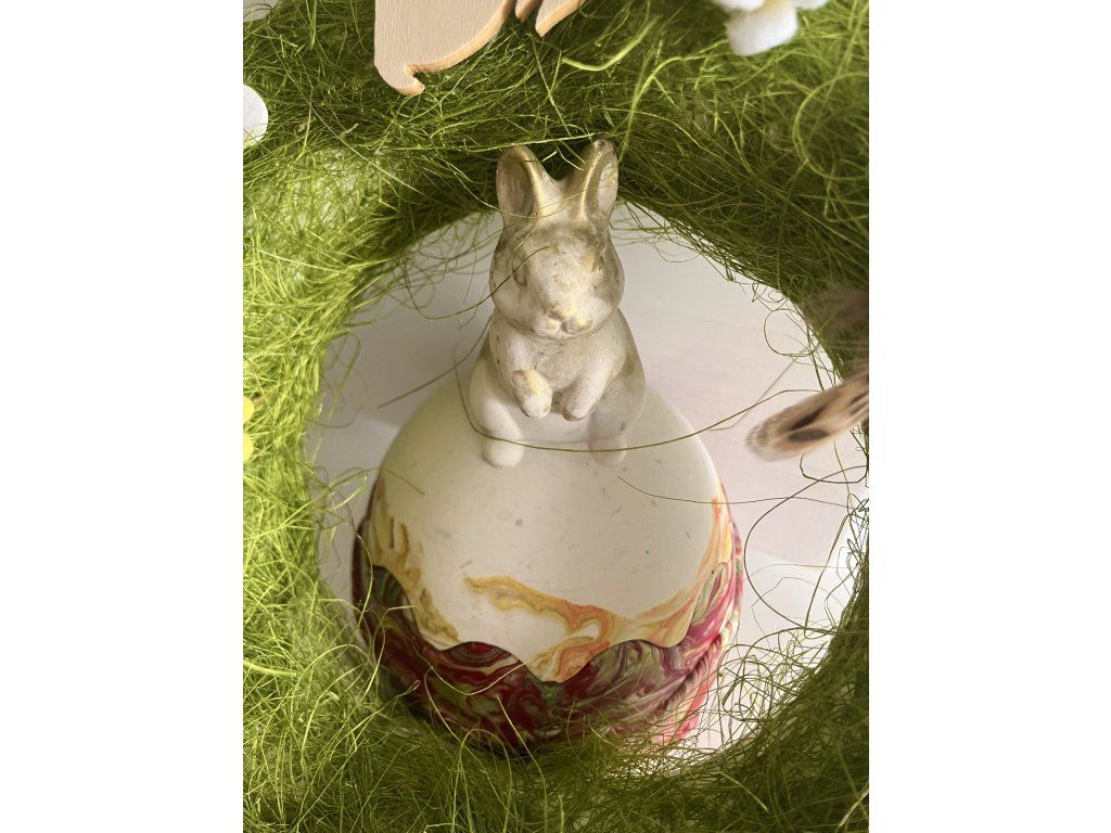Velká svíčka v obalu ze hmoty jesmonite s vůní mléčné čokolády, protože ta k Velikonocům neodvratně patří. Obal po vypálení lze využít třeba jako květináček, nebo krabička na šperky.