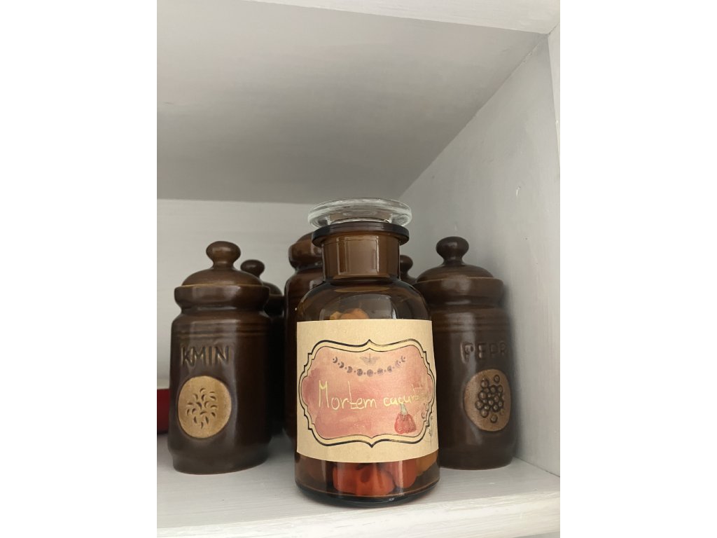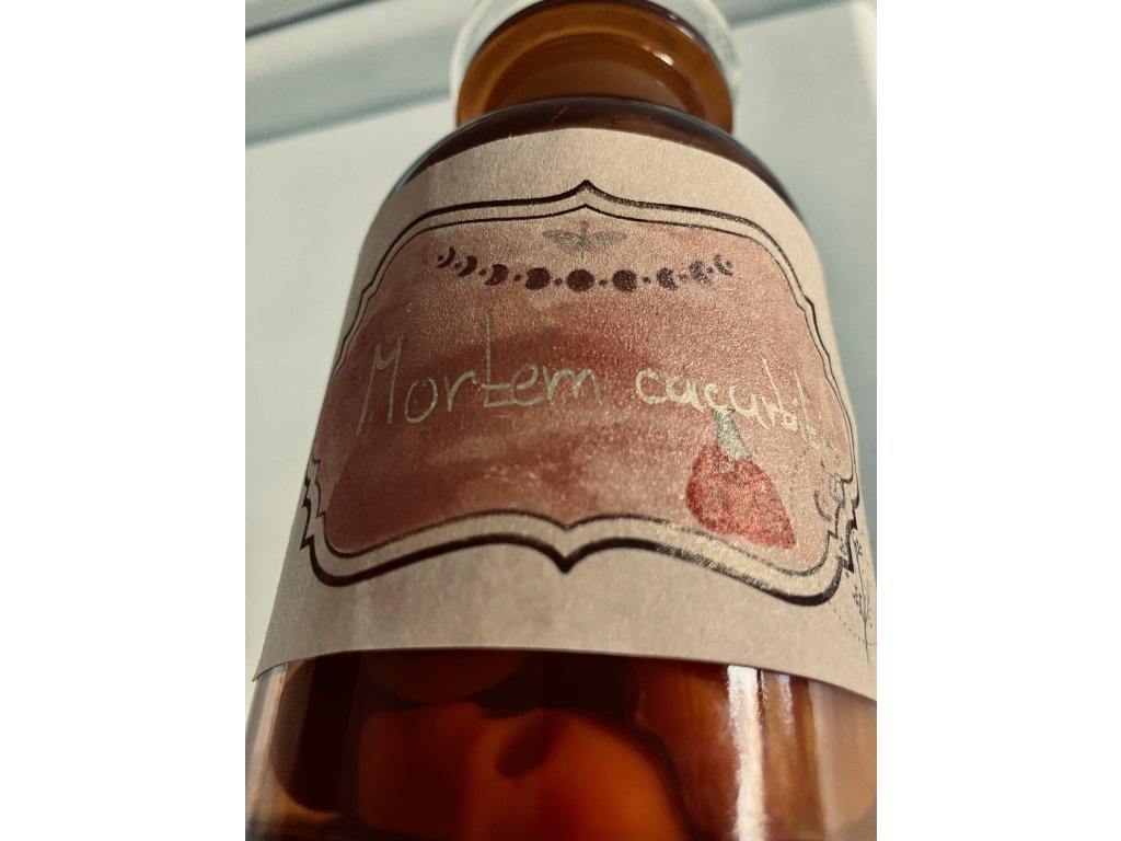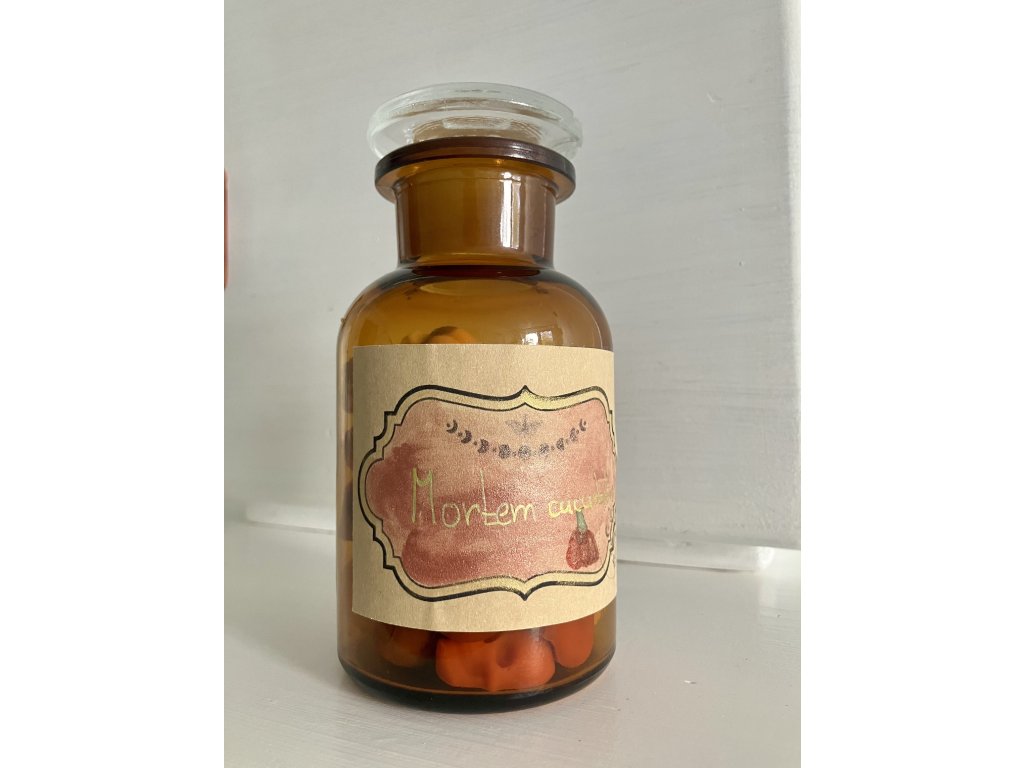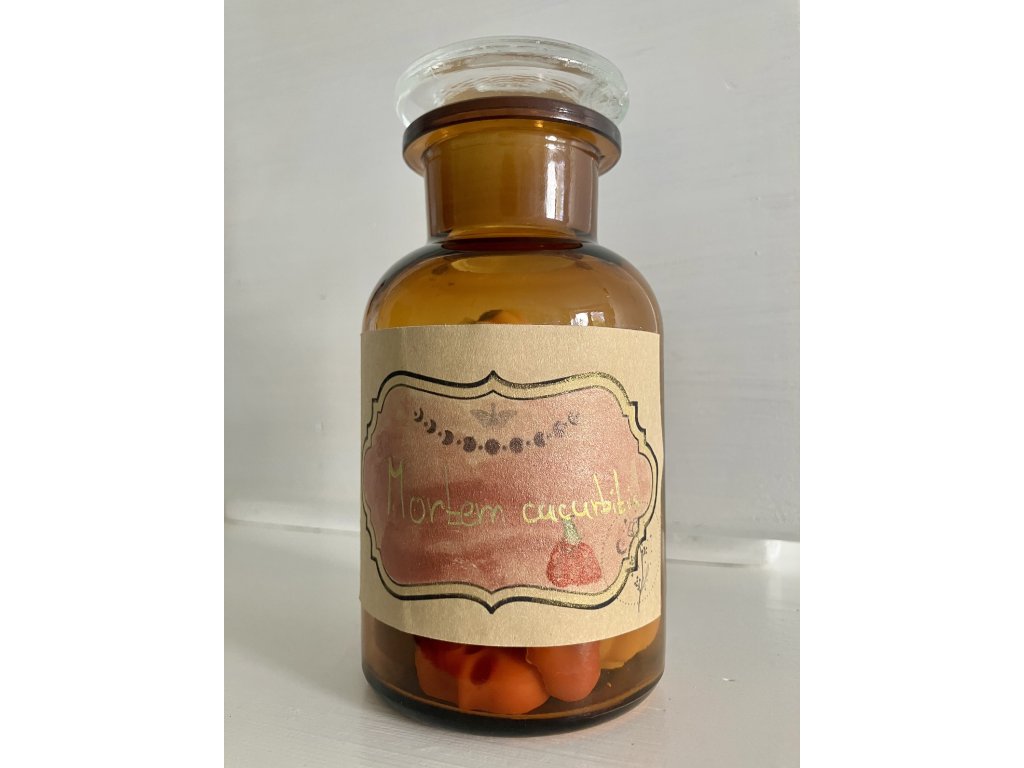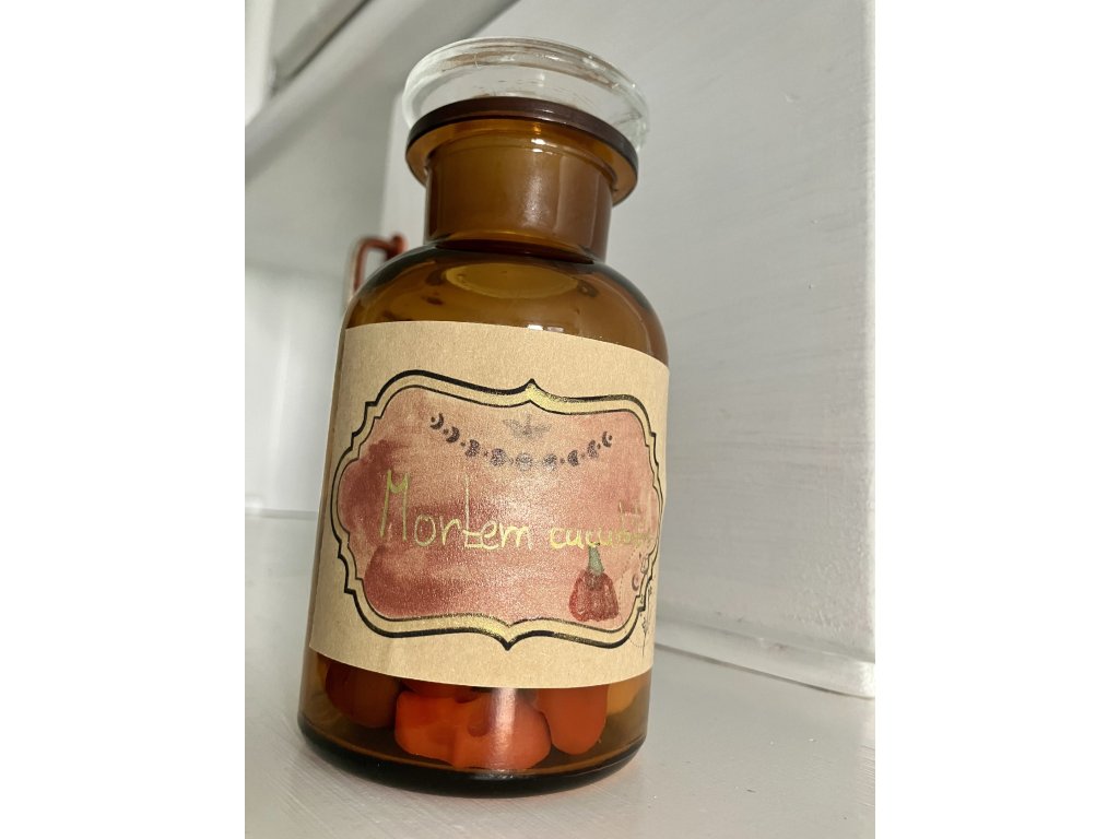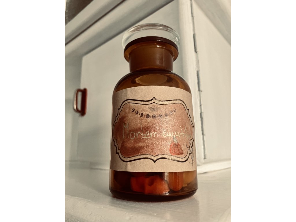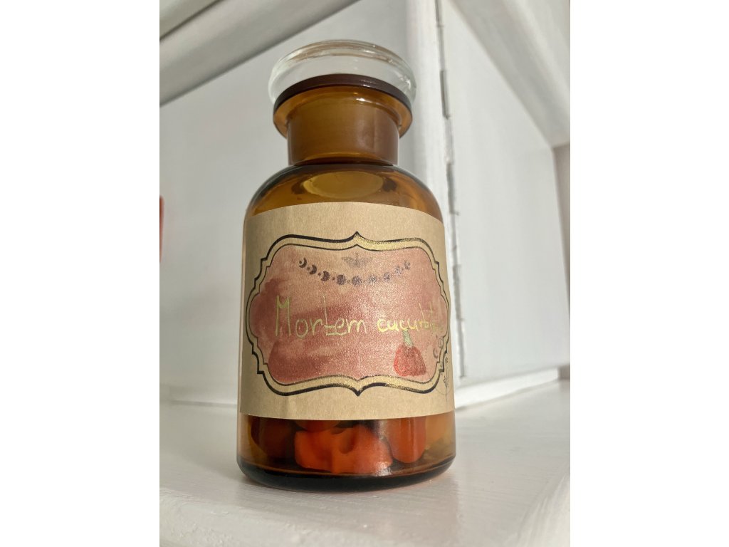 Mortem cucurbitis je lektvárek plný dýní a lebek. Poslouží jako ozdoba na poličku, ale samozřejmě také jako vonný vosk. Stačí část obsahu vysypat do aromalampy a je to. Jde o ruční práci, od etikety po obsah. Proto není lektvar ve všem dokonalý, ale rozhodně jde o jedinečný originál.