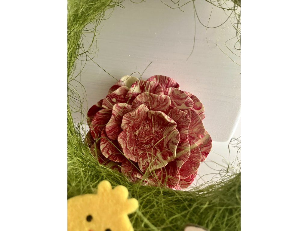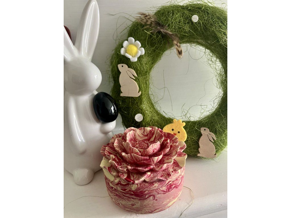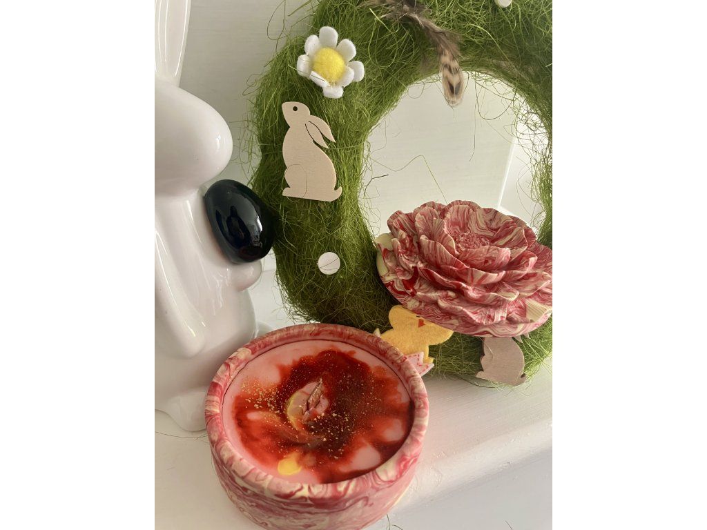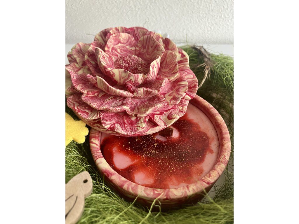Základ svíčky ze 100 % přírodního sójového vosku s ozdobnou růží z minerálního gelového vosku.